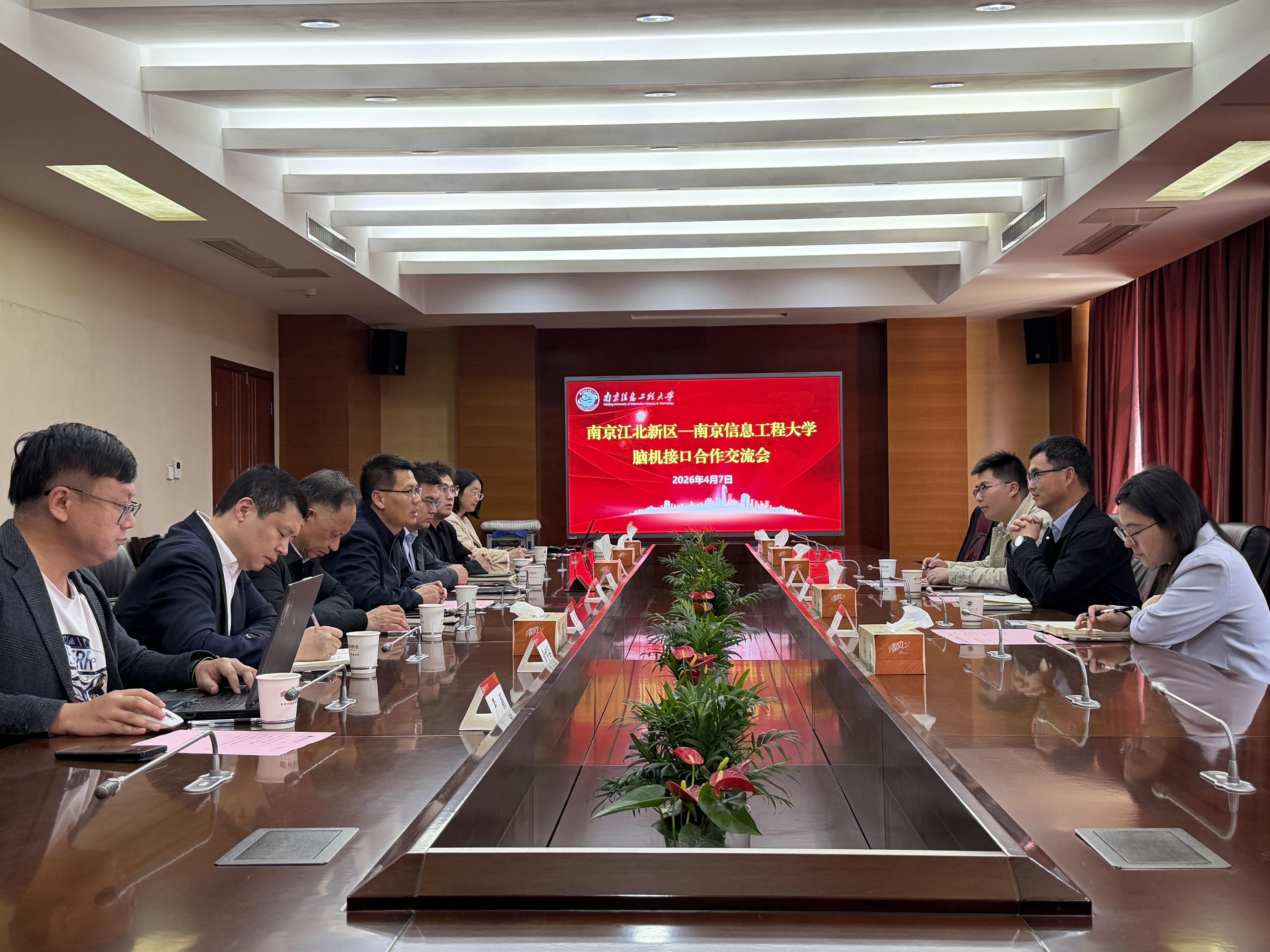 赵强对谈步稳一行的到来表示热烈欢迎,并介绍了学校的学科布局与科研优势。他表示,南信大在柔性电子、传感器、算法与自动化控制等领域积淀深厚,已整合跨学科团队开展脑机接口核心技术研究,与江北新区生物医药谷产业发展方向高度契合。他希望,未来双方深化校地合作,共建创新平台、联合开展技术攻关,进一步推动产学研成果转化,助力脑机接口产业高质量发展。